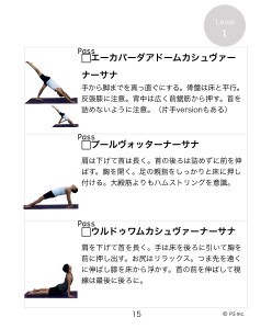 必要に応じて、認定講師が骨格特性の確認やアライメントの助言、修正、そしてポイントを指導します。アーサナを十分に習得できたら、認定講師がアーサナ毎に「PASS(習得の認定)」をします。